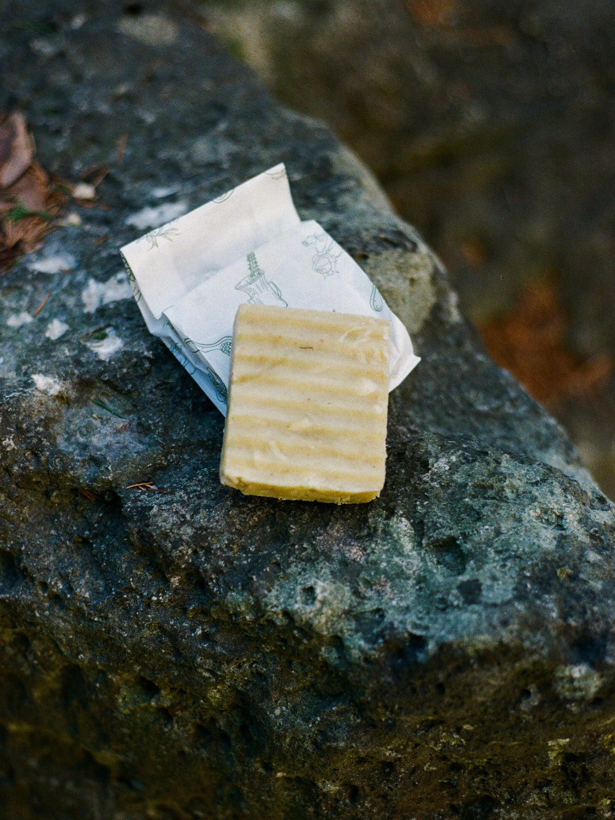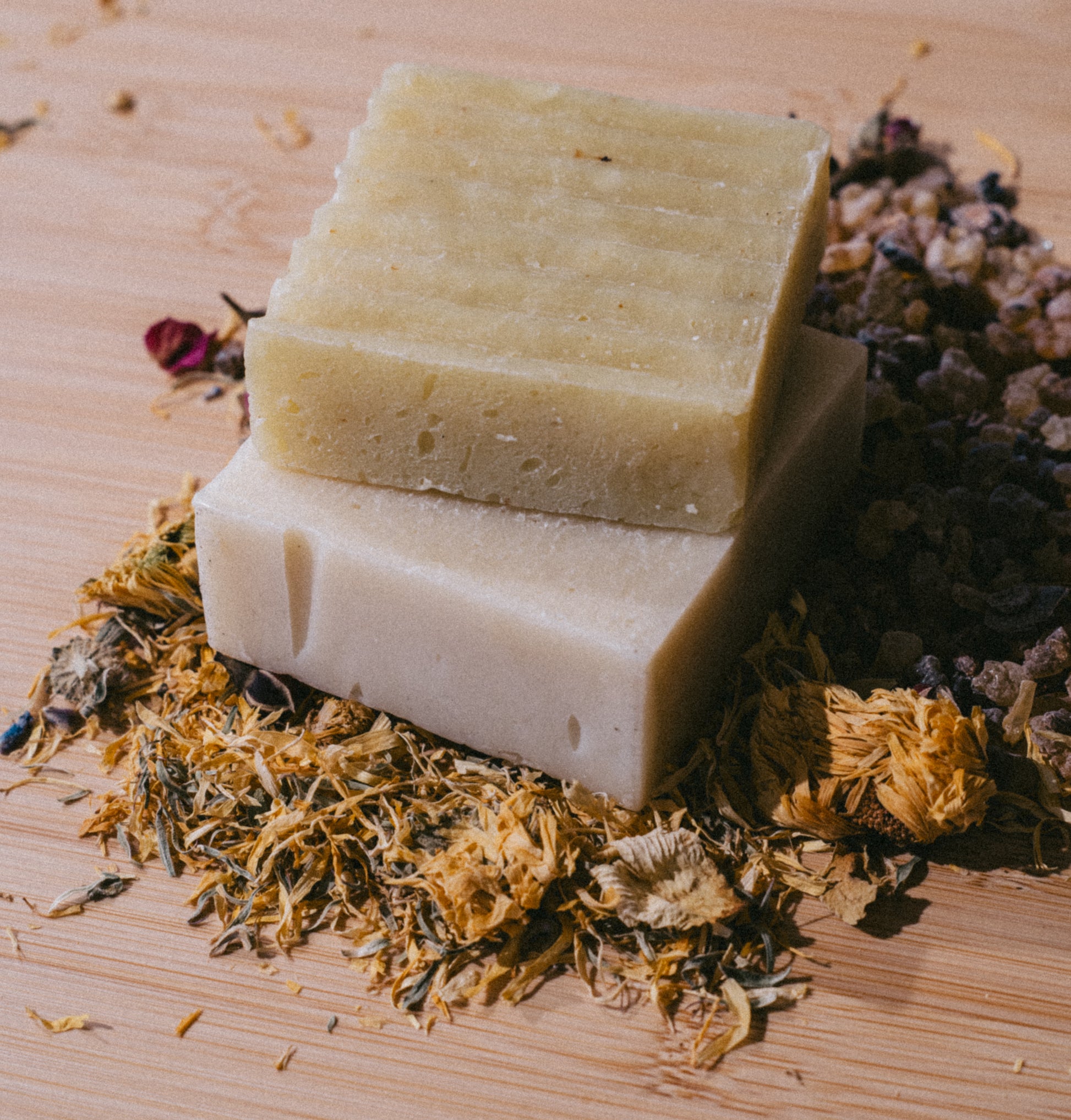 Extra Virgin Olive Oil*, Extra Virgin Coconut Oil*, Jojoba Oil*, Castor Oil*, Raw Shea Butter*, Cocoa Butter*, Lye, Water, Nettle Leaf Extract, Chamomile*, Calendula*, Peppermint Essential Oil*, Rosemary Essential Oil*, Frankincense Resin, and Myrrh Resin